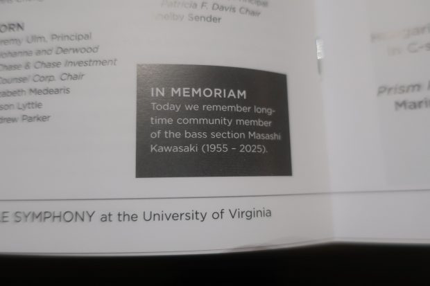 UVA Symphonyのオープニング・ナイト(今学期の演奏会初日)でした。過去17年間ずっとコントラバスセクションにいて、心から音楽を楽しんで演奏していた私の夫は、いなくなってしまいました。