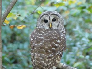 散歩中、久し振りにアメリカフクロウ(Barred Owl)と目が合いました。