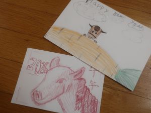 毎年恒例の、日本大使館広報文化センター(JICC)が主催する年賀状コンテストに作品を送るため、今日は図書室で年賀状に馬の絵を描きました。